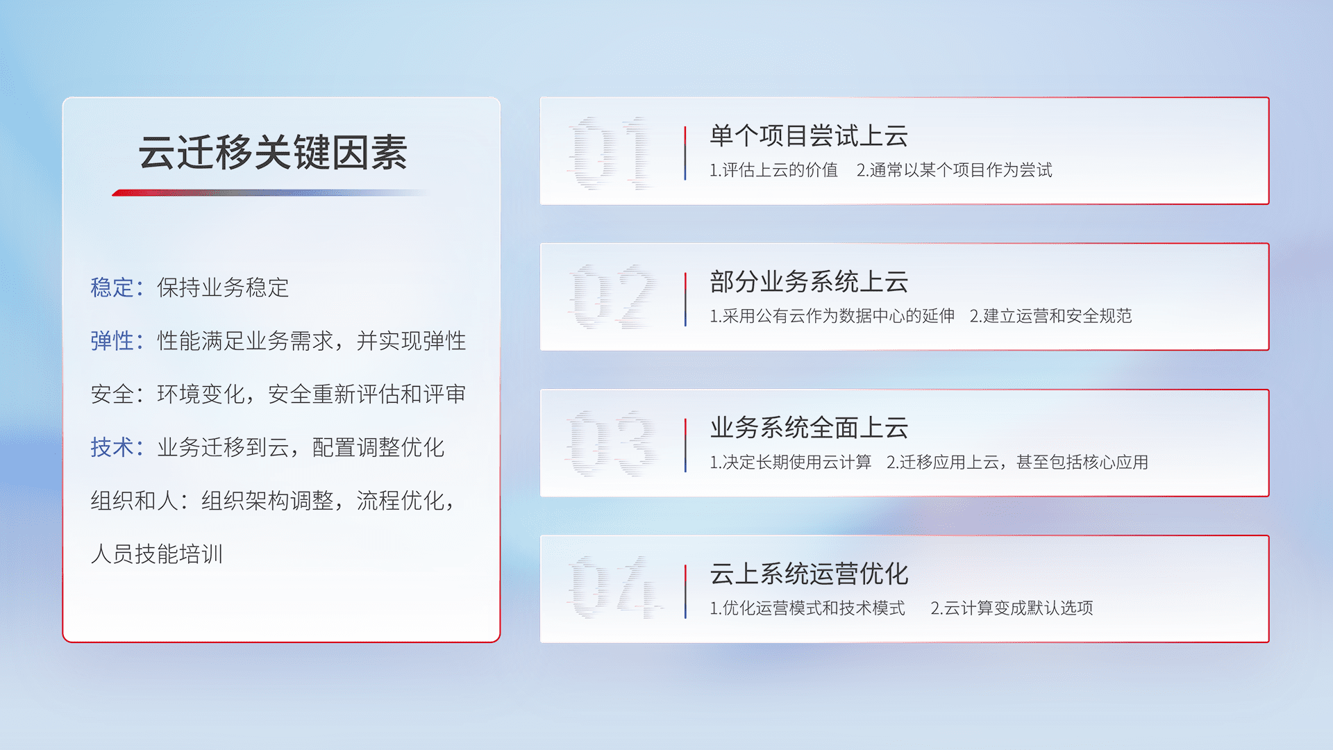结合实际业务,,,,从规划设计、、云平台选型、、云原生改造、、数据迁移、、集成交付,,,,迁移全过程为客户识别最佳上云路径,,,做好风险识别管理,,,设计网络架构、、、身份权限、、安全审计合规、、、、操作审计、、、日志审计、、监控告警策略、、、、多站点容灾设计等,,,,对云上基础设施进行整体规划,,提升IT治理水平,,,,以满足弹性、、、、高可用、、高性能的需求。。。。